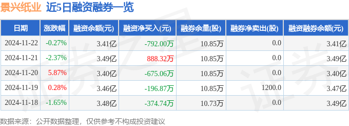 景兴纸业融资融券信息显示,融资方面,当日融资买入3304.1万元,融资偿还4096.1万元,融资净偿还792.0万元。融券方面,融券卖出0.0股,融券偿还0.0股,融券余量10.85万股,融券余额40.04万元。融资融券余额3.41亿元。